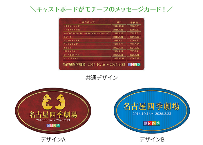 現・名古屋四季劇場にご来場いただいたお客様へ感謝を込めて、対象公演にご来場の皆様へプレゼント(劇場にちなんだオリジナルミニカード) をお渡しいたします。