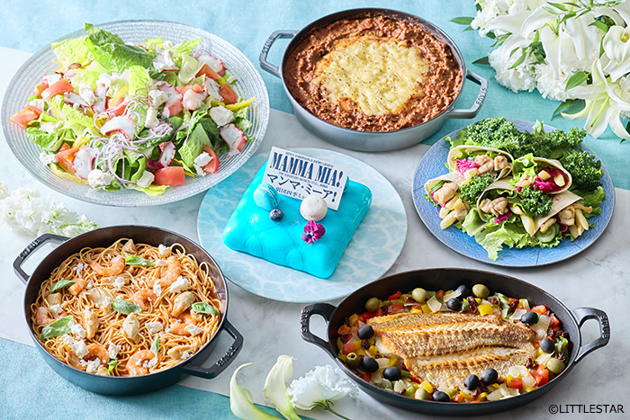 ストリングスホテル 名古屋のブッフェレストラン「シェフズ ライブ キッチン」で開催される「地中海フェア~豊かな海の恵みと魅惑の苺スイーツ~第一弾」内で、『マンマ・ミーア!』の世界を表現した6品のコラボレーションメニューが登場!作品の世界観を表現した、お料理とスイーツをぜひお楽しみください。