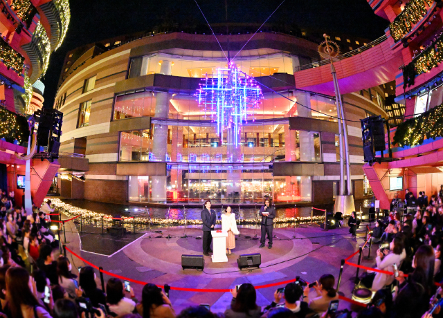 劇中でクリスティーヌとラウルのふたりが愛を誓い合うロマンティックなナンバー「オール・アイ・アスク・オブ・ユー」を披露すると、会場のお客様からは盛大な拍手が。続くトークでは、作品の魅力や福岡公演への思いを語りました。 そしていよいよ点灯の瞬間。お客様のカウントダウンとともに、ふたりが息を合わせてスイッチを押すと、一斉にイルミネーションが点灯!ステージ上空にある直径約3メートルの光のオブジェが一際明るく輝き、藤原と宇都宮は感嘆の声を上げて美しいイルミネーションに見入りました。