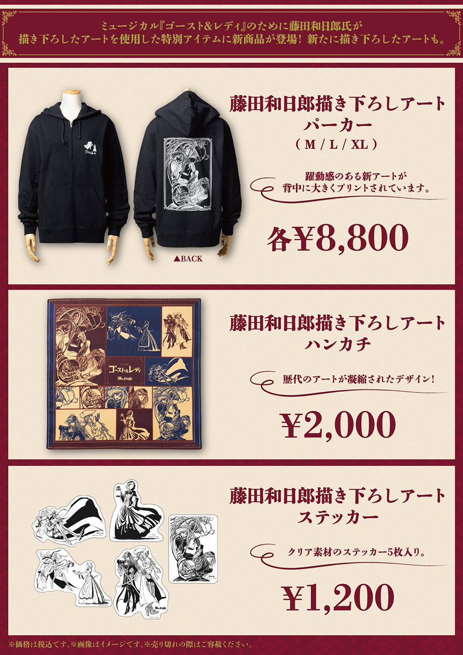ミュージカル『ゴースト&レディ』のために藤田和日郎氏が描き下ろしたアートを使用した特別アイテムに新商品が登場!新たに描き下ろしたアートも。