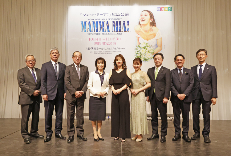 右から中国放送 代表取締役社長・宮迫良己氏、中国新聞社 代表取締役社長・岡畠鉄也氏、広島商工会議所 会頭・松藤研介氏、三代川柚姫(ソフィ・シェリダン役)、江畑晶慧(ドナ・シェリダン役)、広島県知事・横田美香氏、広島市長・松井一實氏、広島経済同友会 代表幹事・小田宏史氏、劇団四季代表取締役社長・吉田智誉樹