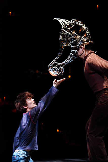 舞台上には円形装置が組まれ、その外周には客席となるステージシートが階段状になって連なります。円の内側にはスクエアに囲われた芝居空間。天井は、ライブ会場のように照明器具がむき出しになっています。